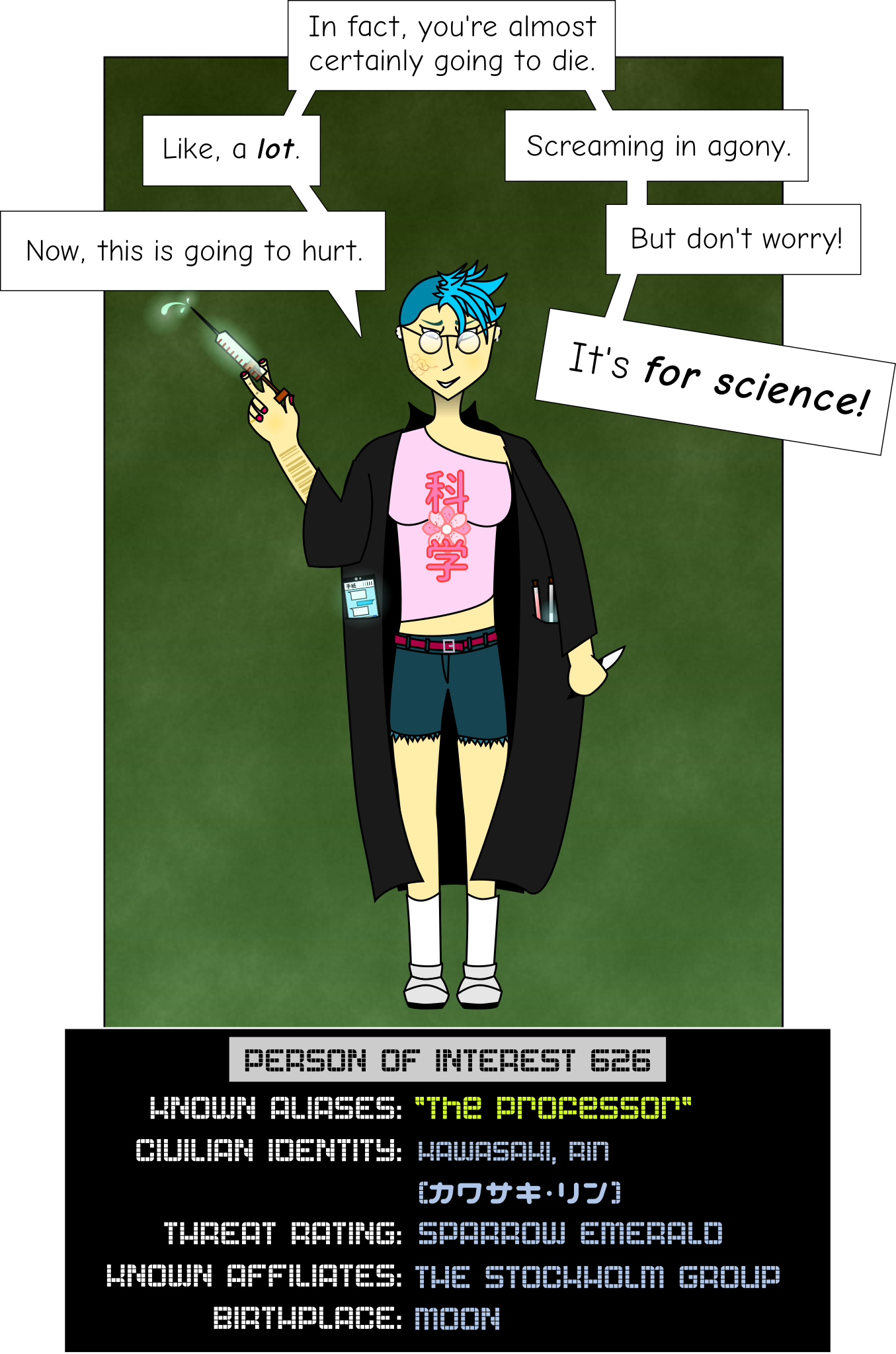 Dr. Kawasaki Rin (川崎凛博士) was formerly a "BERLIN BLACK" researcher operating under the direct supervision of the Chairwoman. However, on 2008-[CL: TEMPEST EGRET], Dr. Kawasaki absconded with hundreds of confidential files, most of which were classified at "TYPHOON EAGLE." She is believed to have been operating underground since then, and only recently surfaced to join the Stockholm Group. Her only other known affiliate at present is the Facebook page "I Fucking Love Science," which she moderates.